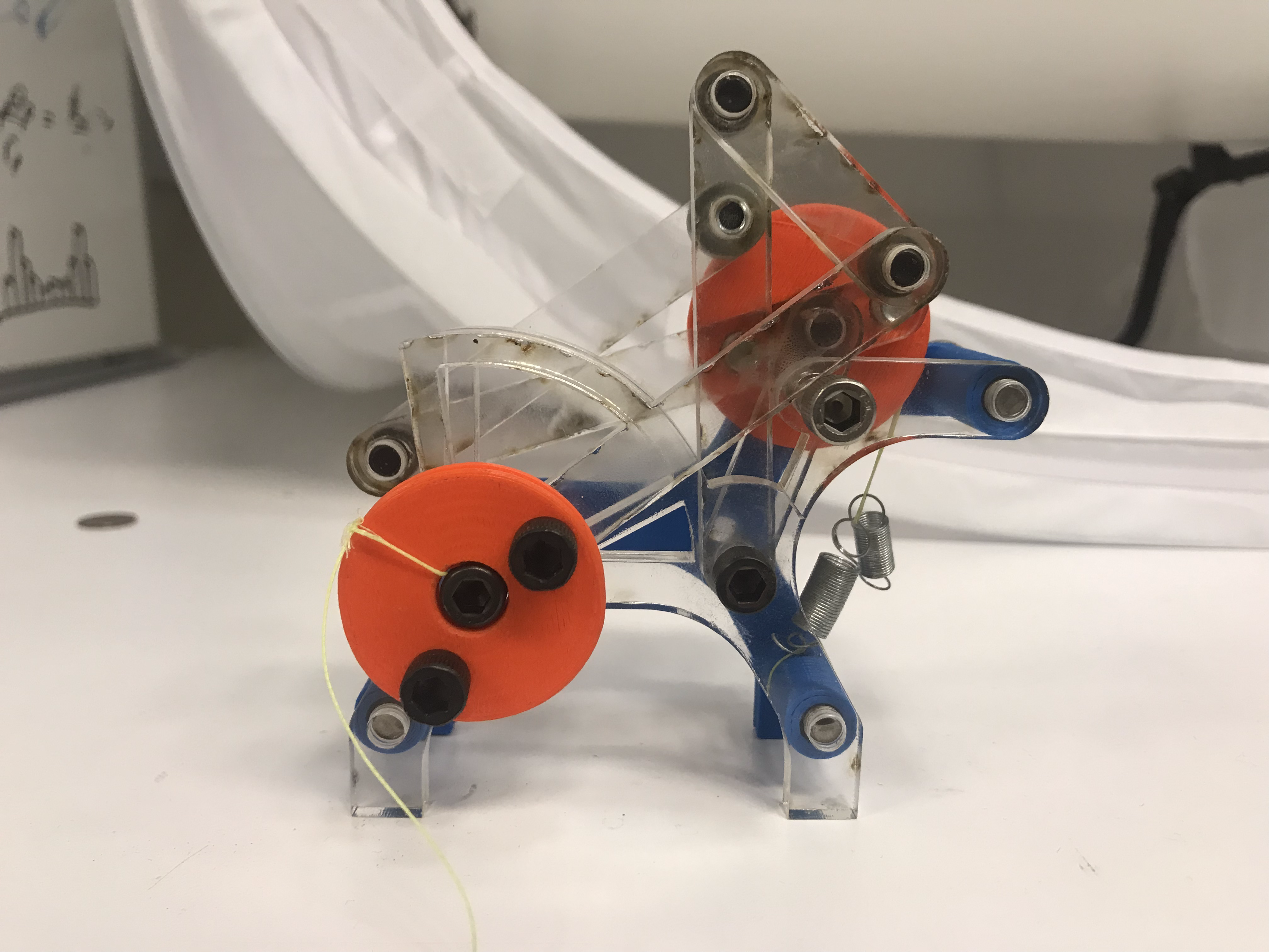 This mechanism was designed and built solely by me following the methodology described by Gregory Starr of the University of New Mexico. In this paper, Starr presents a way to find link lengths for a four bar linkage such that the angles of the rocker and crank obey a specific functional relationship. By defining three points (characteristic of the specified function) along the rocker's path, Starr shows that it is possible to generate a simple system of equations that will uniquely constrain the link lengths. Since I wanted to create a constant force mechanisms, I created a linkage such that the angle of the rocker changed like the square root of the angle of the crank. Then, by connecting the rocker to a Hooke's law spring (which stores energy like position squared), the crank experienced an approximately constant force.
