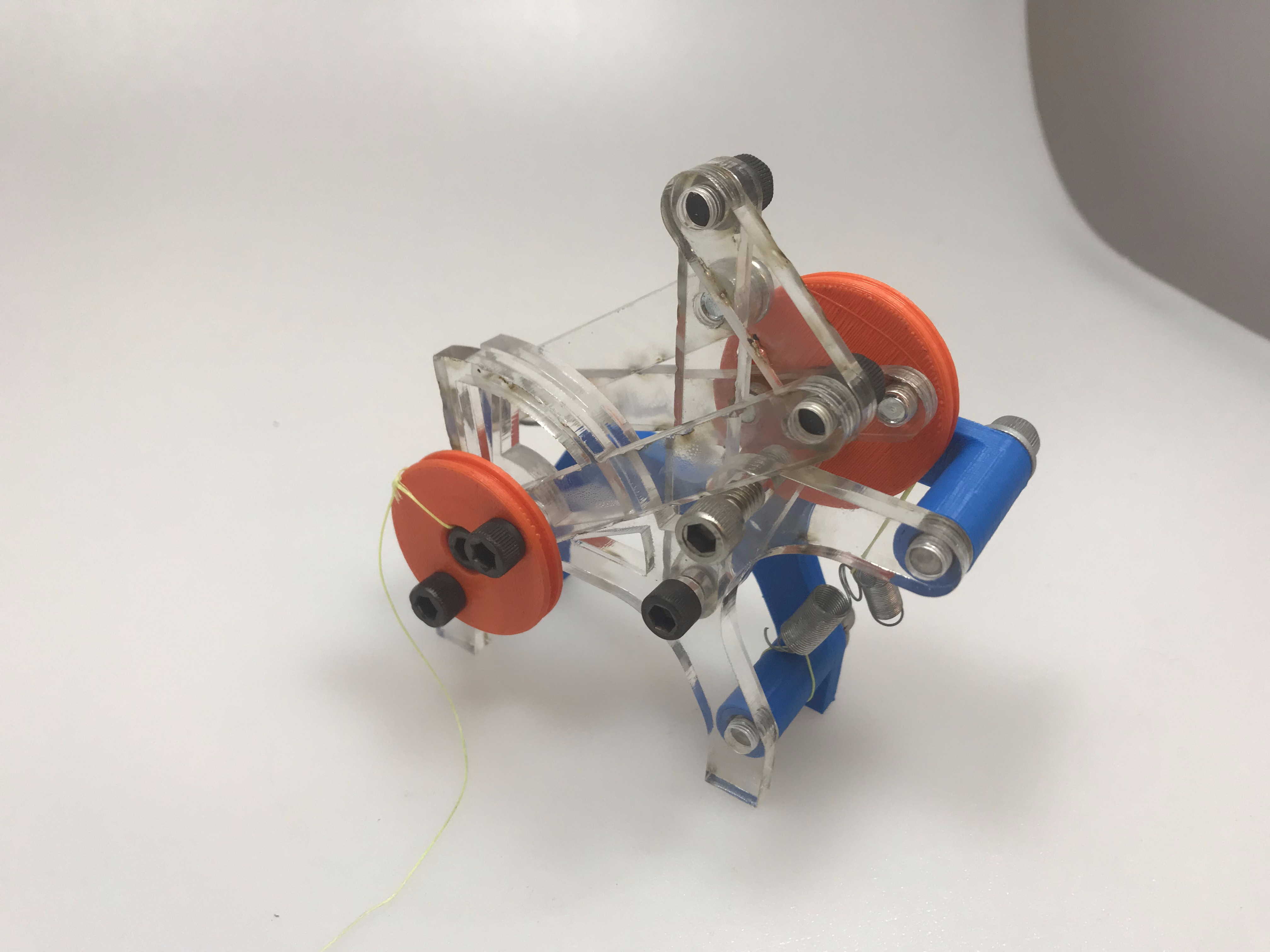 Fabrication process: Most of the parts for this mechanism were 2.5-dimensional, and thus able to be fabricated with a laser cutter. There were two parts—the pulleys attached to the rocker and the crank—that were properly three dimensional and were created by a 3D printer. The mechanism was assembled using 1/4-20 screws. To couple the rocker pulley to the spring and the crank pulley to the output force, I used 50 lb. fishing line.